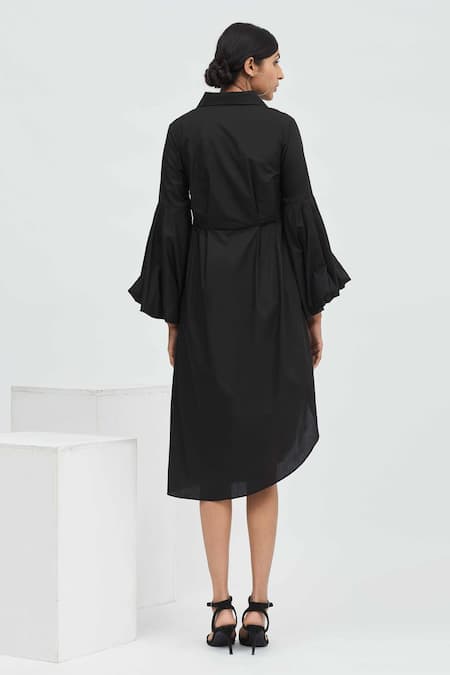 Black cotton dress with asymmetrical hem, puff sleeves and spread collar.