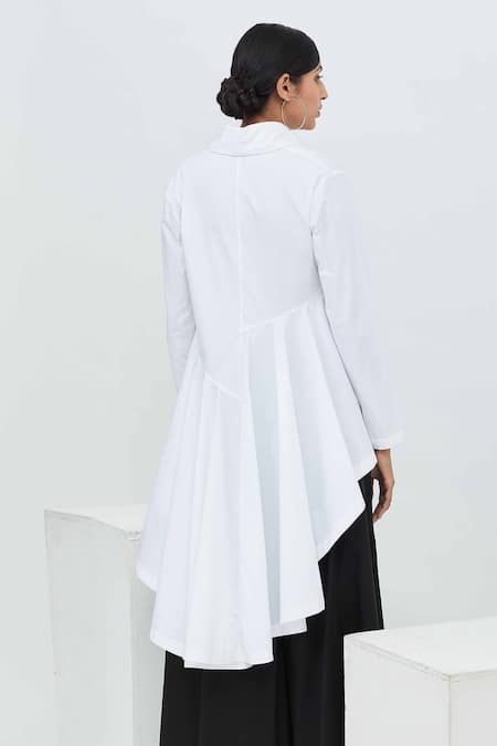 White overlap style shirt with asymmetrical hem and flared detail at the back.
