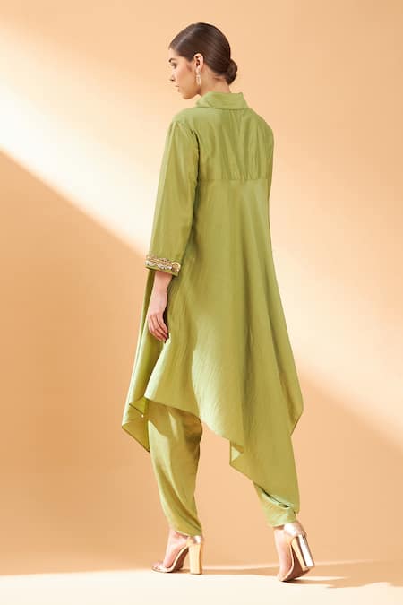Green Cotton Silk Sequin And Beads Collared Neck Tunic & Draped Pant Set