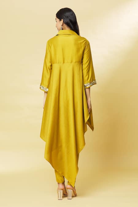 Mustard tunic with embroidery on the sleeve hems and spread collar. Comes with draped pants.