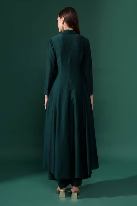 Emerald green overlapping blazer kurta featuring full sleeves and a lapel collar with crystal flora applique detail. Paired with matching flared pant for a cohesive look.