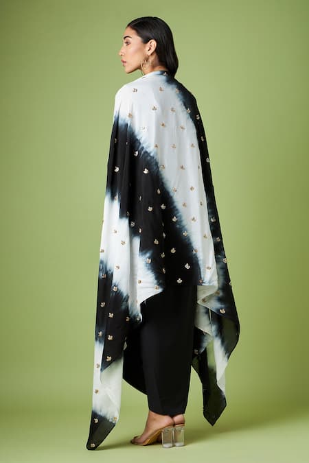 Black draped dress featuring an asymmetric hem and U neck design. Paired with a tie-dye sequin embellished cape with flared sleeves.