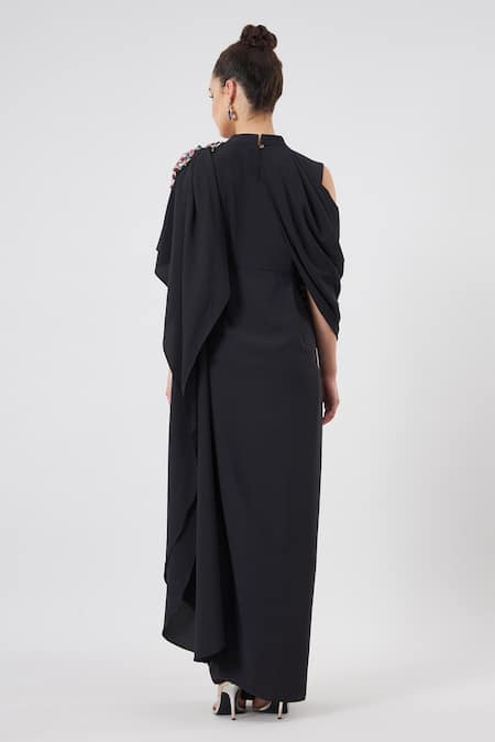 Black maxi gown featuring a band collar and asymmetric sleeves with a crystal embroidered shoulder detail