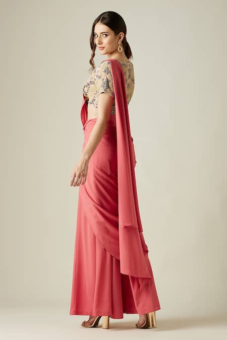 Pink moss crepe palazzo saree with draped pallu. Paired with round neck blouse with floral sequin & bead work embroidery.