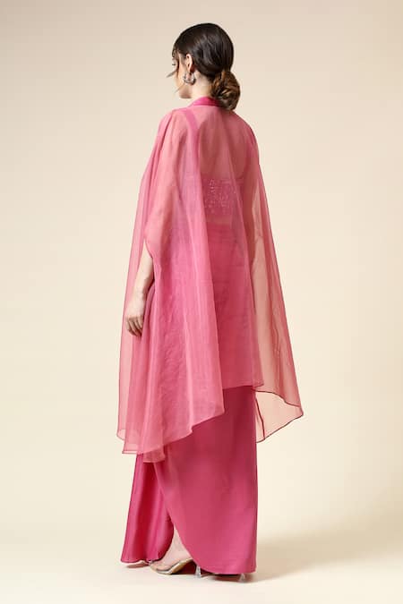Buy_Aakaar_Pink Organza, Cotton, Silk Geometric Embroidered Blouse Draped Skirt Set