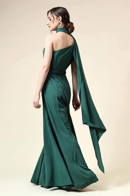 Bottle green jumpsuit featuring a gathered one shoulder design with a draped neckline. Paired with a crystals embellished belt for added elegance.