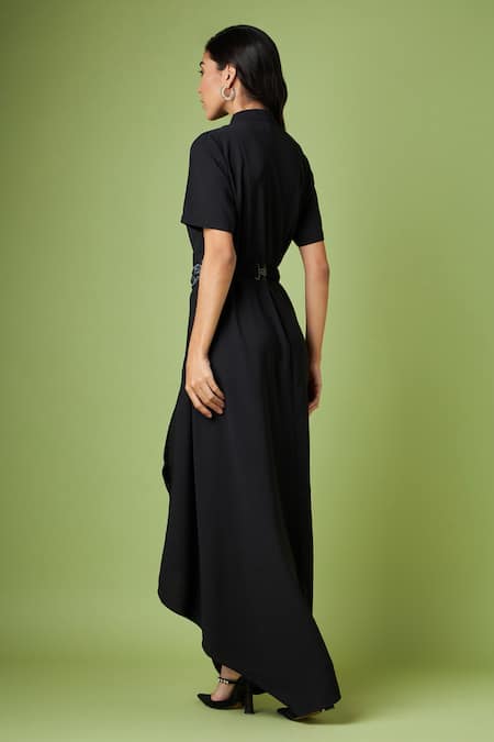 Black draped dress featuring a mandarin collar and half sleeves. Paired with a crystal embellished belt and front button detailing.