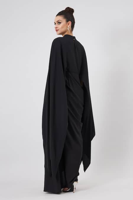 Black gown in moss crepe featuring a band collar and flared sleeves