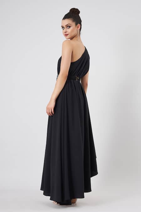 Black Muslin Beads, Crystals, Sequins One Shoulder Gown With Embellished Belt