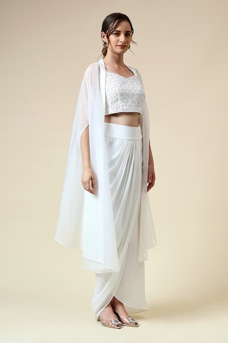 White blouse featuring pearl and sequin embroidery in geometric patterns. Paired with a matching draped skirt and a lightweight cape.