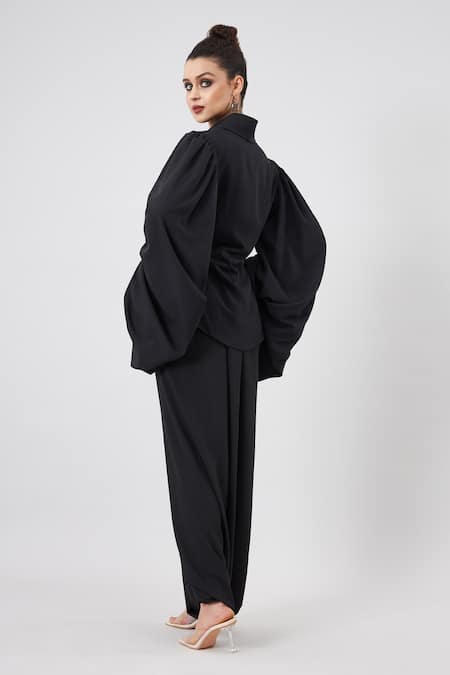 Black moss crepe blazer with shawl collar and full sleeves. Paired with a draped pleated skirt and embellished crystal belt.