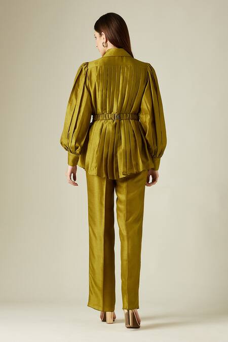 Olive green matka silk pleated tunic with puff sleeves and wide shirt collar. Comes with embellished belt & straight fit pant.