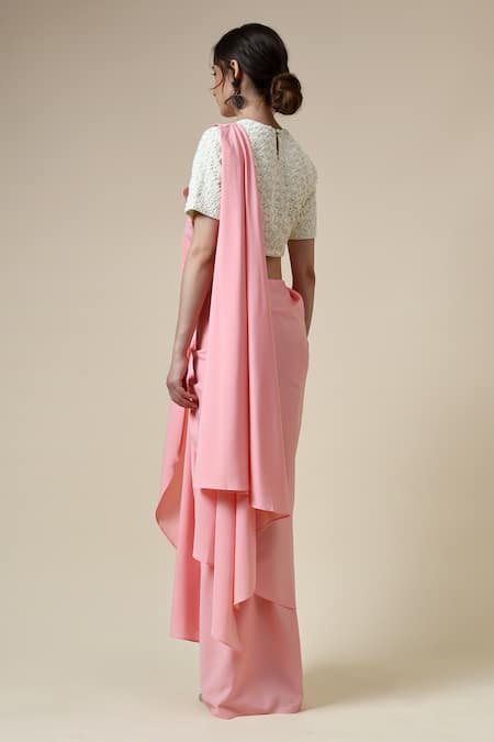 Pink pre-draped saree featuring cascading drapes. Paired with a white blouse embellished with sequins and glass beads in a geometric motif.
