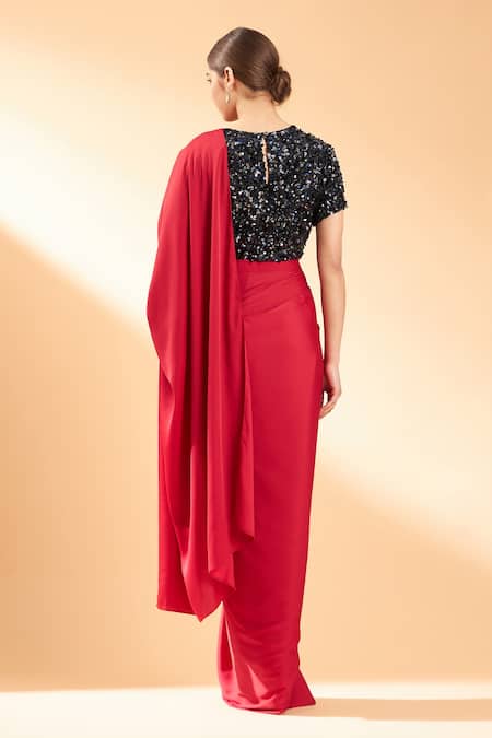 Red pre-draped saree with attached pallu. Comes with embroidered blouse.