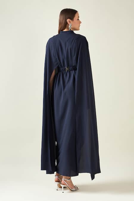 Navy blue solid woven dress featuring a band collar and drop shoulder sleeves. Designed with an armour style sleeve, pleated panel draped skirt, and metallic button detailing, it comes with an adjustable metallic belt.