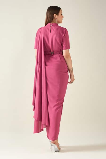 Pink Buckles Collared Solid Saree Style Draped Dress With Metallic Belt
