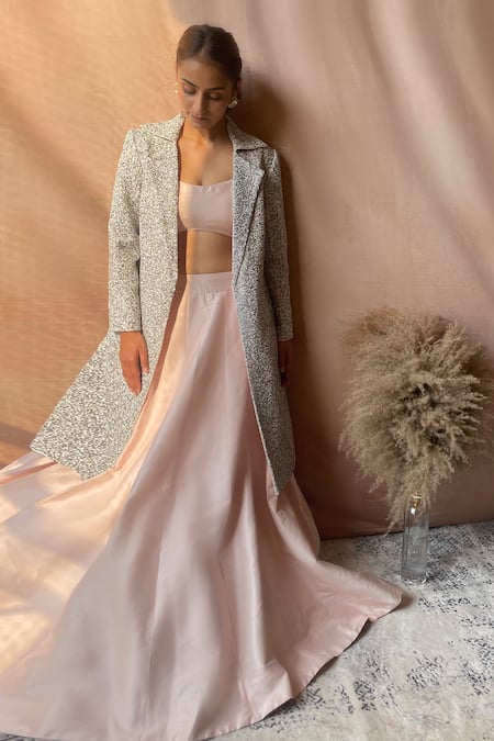 Peach lehenga set featuring a full sleeve jacket with notched lapel collar and pearl, cutdana embroidery. Includes a padded blouse and attached cancan for volume.