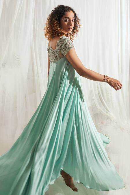 Blue maxi dress featuring a cutwork neckline adorned with bead and cutdana embroidery