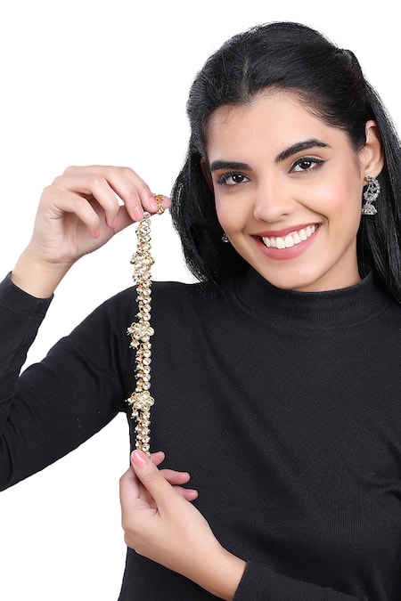 Gold plated anklet set featuring kundan floral embellishments with white and green bead work. Set includes two anklets with dimensions of 26 cm in length and 2.8 cm in width.