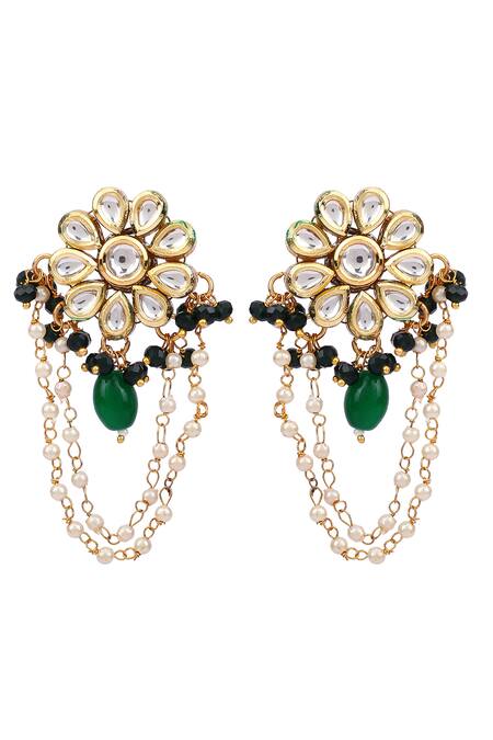 Kundan floral top with emerald accents, Motif latkans with pearl chains