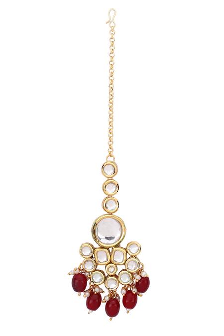 Gold plated maangtikka featuring kundan and red agate beads in a chaandbali and geometric design