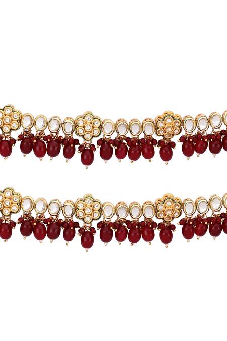 Red anklet set featuring intricate embellishments of kundan, polki, and bridal ruby stones. The design incorporates pearl details in both floral and geometric patterns, crafted from a durable metal alloy.