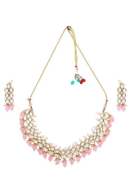 Gold finish kundan choker necklace studded with motifs & pink quartz drops. Comes with a matching pair of earrings.