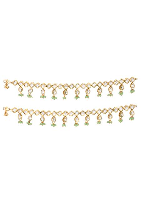 Gold plated finish with kundan drops, Olive green bead accents, Set of 2 anklets with intricate design