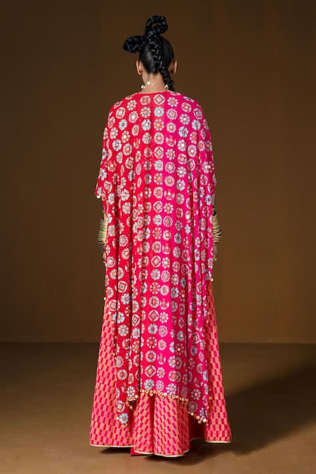 Fuchsia printed cape featuring mirror embroidery and floral designs. Paired with a sleeveless bustier and a sharara with geometric patterns.