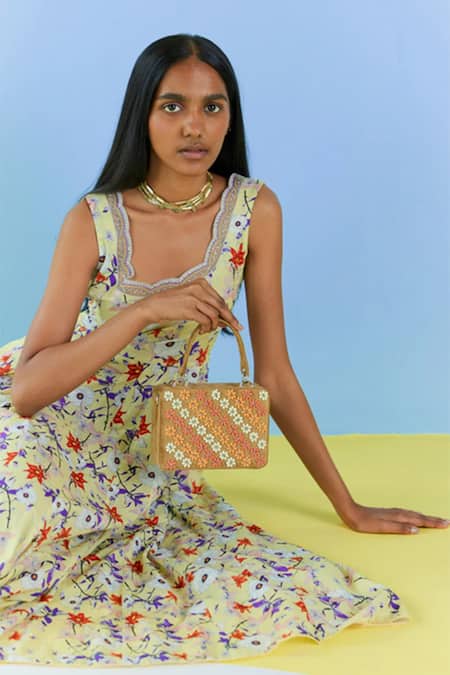 Gold silk velvet boxy cross body clutch featuring floral sequin work