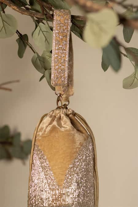 Gold silk velvet bucket bag featuring intricate bead embroidery and a tassel drawstring