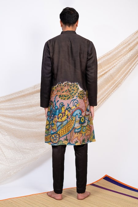 Black kurta featuring ancient Sena Kalamkari print with zardozi embroidery on the placket. Paired with matching pant for a complete look.
