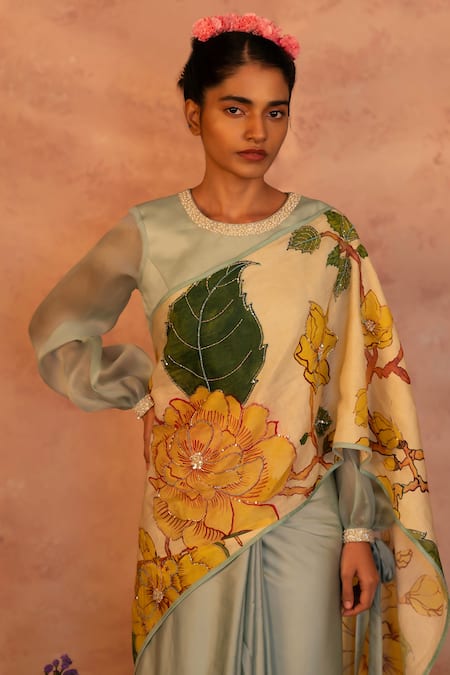 Blue saree featuring hand-painted kalamkari floral design with intricate sequin, pearl, and bead embroidery. Paired with a puff sleeve embroidered padded blouse with a back cutout.
