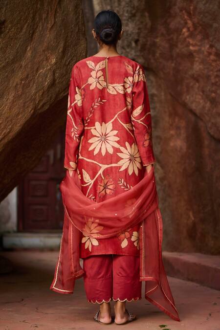 Maroon Cotton, Silk, Linen Embroidery, Sequins Floral Kalamkari Kurta Pant Set