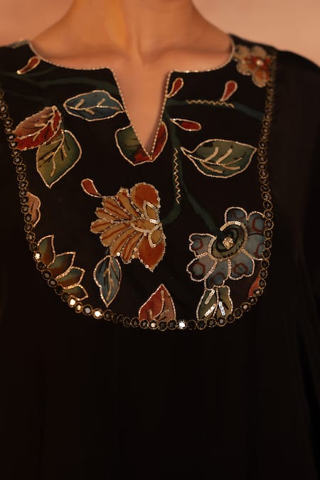 Black Crape Hand Embroidery Mirror Notched Painted Kaftan With Pant