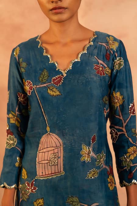 Indigo blue straight kurta featuring hand painted floral kalamkari and bird cage design with sequin, pitta, and pearl embroidery. Paired with a mustard dhoti pant adorned with pearl and bead embellishments.