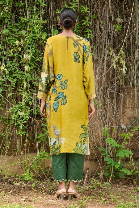 Ochre yellow kurta featuring hand painted birds and flamingo motifs with placed sequins hand embroidery. Paired with teal pants adorned with scalloped hem and sequins embroidery.