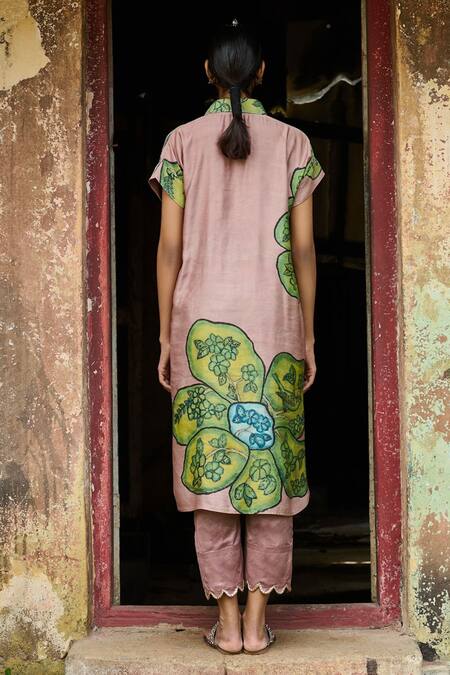 Pink Cotton, Silk Embroidery, Sandrose Kalamkari Floral Shirt Kurta With Pant