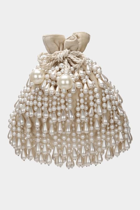White potli bag featuring pearl embroidery and hand beaded tassels