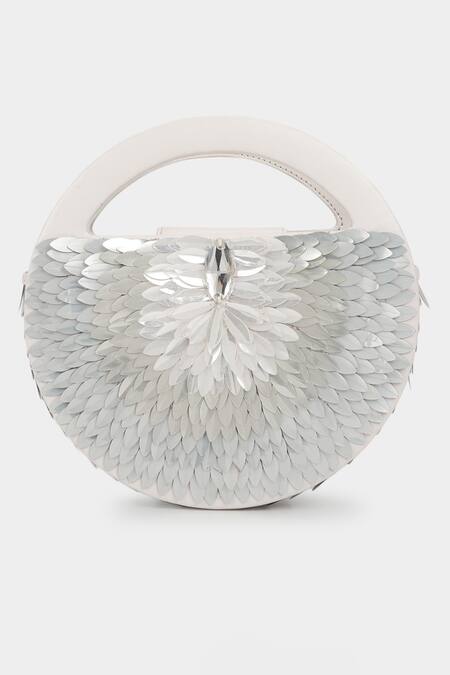Silver clutch featuring metallic leaf embellishments and a detachable chain strap