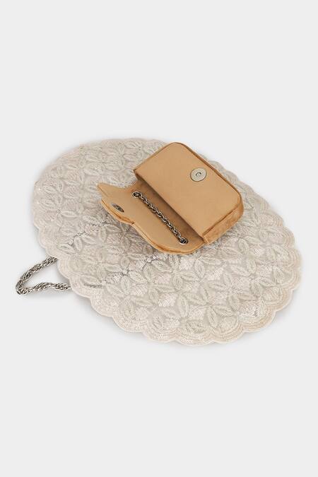 Silver handbag featuring cutdana and sequin embellishments on net fabric. Designed with a structured silhouette and a decorative drape attachment.