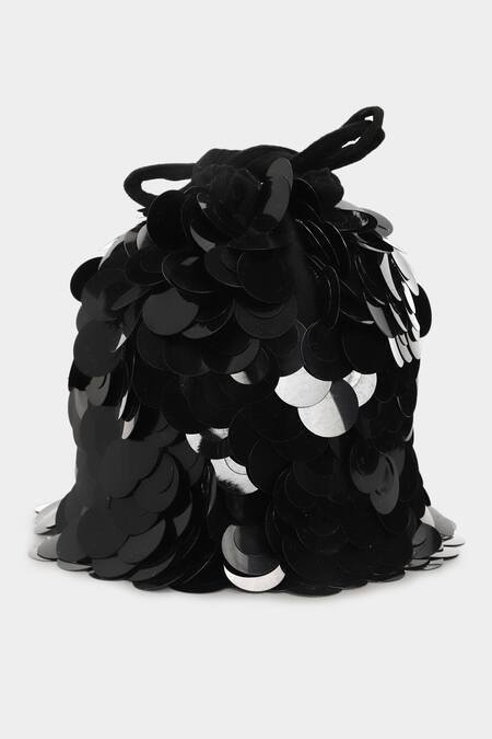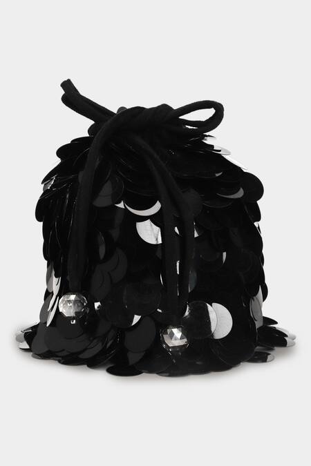 Black bucket bag crafted from suede featuring sequin applique work and crystal detailing on the drawstring