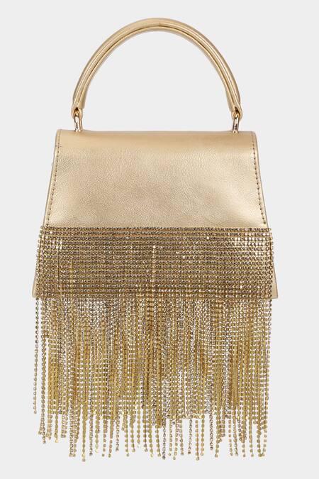 Gold suede handbag featuring a rectangle shape with studded chain danglers and a stitched embroidered border