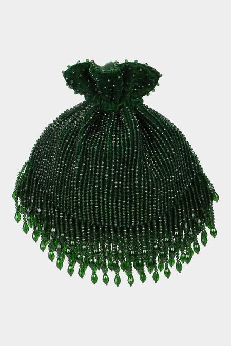 Emerald green velvet potli featuring intricate crystal embroidery in a stripe pattern
