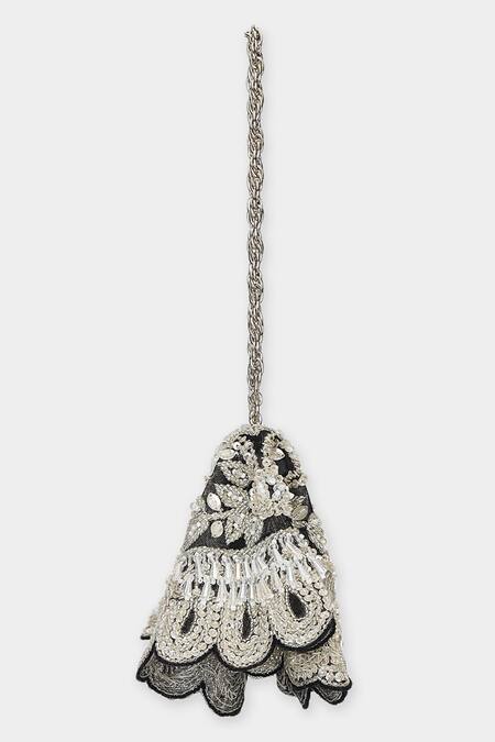 Black and silver drape bag featuring intricate cutdana and sequin embellishments. Dimensions are 13 x 8 x 2 cm, made from net fabric.