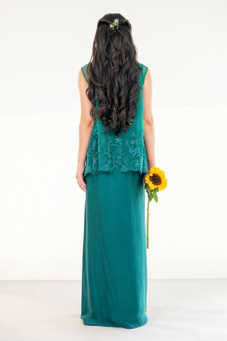 Teal green sleeveless V neck blouse paired with a draped skirt featuring front pleats. Accompanied by an organza jacket with 3D daisy bloom applique and cutdana highlights.
