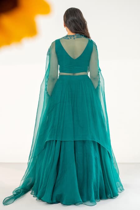 Teal green lehenga featuring floral cutdana embroidered blouse and cape. The set includes a gathered & pleated flare lehenga with an attached cancan and inner lining.