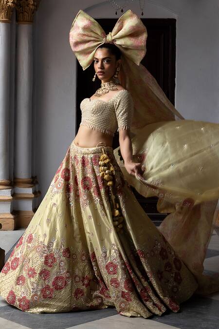 Yellow lehenga featuring intricate floral embroidery and a flared silhouette. Paired with a matching blouse and dupatta, both crafted from pure handloom tissue.