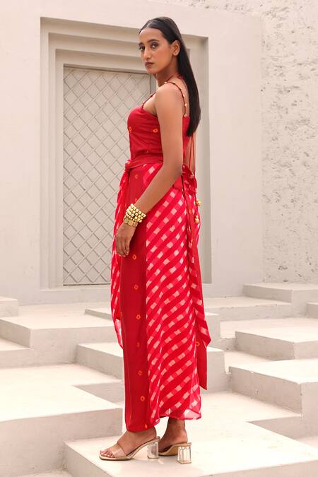 Buy_Aapro_Red Modal, Cotton Satin Beads Halter Neck Blair Bandhej Pattern Dress_at_Aza_Fashions