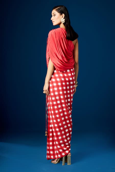 Red dress featuring a one-shoulder design with a gathered draped bodice and checkered pattern
